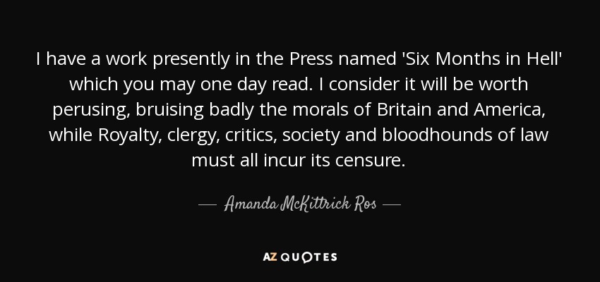 I have a work presently in the Press named 'Six Months in Hell' which you may one day read. I consider it will be worth perusing, bruising badly the morals of Britain and America, while Royalty, clergy, critics, society and bloodhounds of law must all incur its censure.