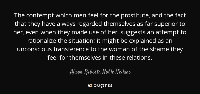 The contempt which men feel for the prostitute, and the fact that they have always regarded themselves as far superior to her, even when they made use of her, suggests an attempt to rationalize the situation; it might be explained as an unconscious transference to the woman of the shame they feel for themselves in these relations.