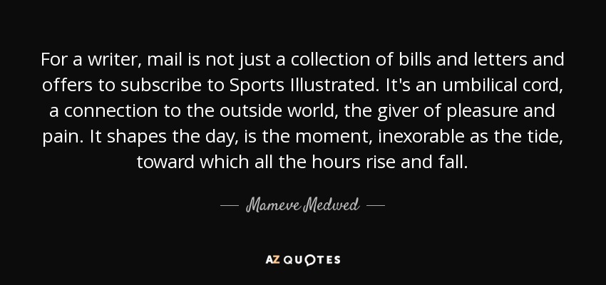 For a writer, mail is not just a collection of bills and letters and offers to subscribe to Sports Illustrated. It's an umbilical cord, a connection to the outside world, the giver of pleasure and pain. It shapes the day, is the moment, inexorable as the tide, toward which all the hours rise and fall.