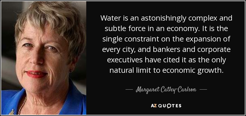 Water is an astonishingly complex and subtle force in an economy. It is the single constraint on the expansion of every city, and bankers and corporate executives have cited it as the only natural limit to economic growth.