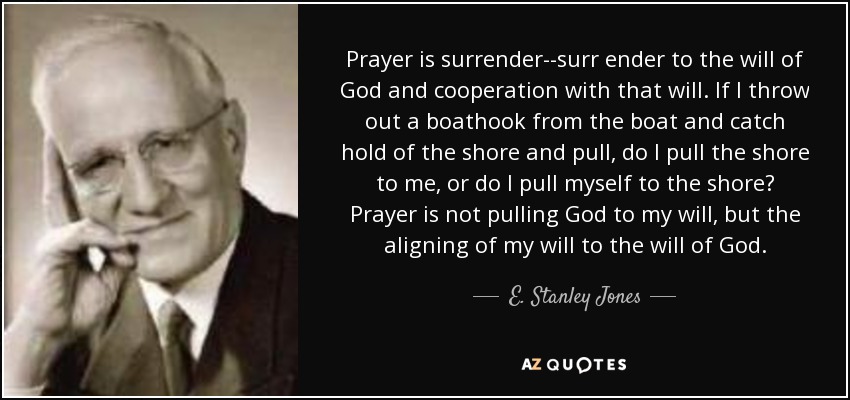 Prayer is surrender--surr ender to the will of God and cooperation with that will. If I throw out a boathook from the boat and catch hold of the shore and pull, do I pull the shore to me, or do I pull myself to the shore? Prayer is not pulling God to my will, but the aligning of my will to the will of God.