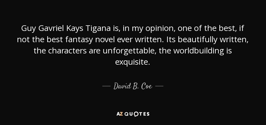 Guy Gavriel Kays Tigana is, in my opinion, one of the best, if not the best fantasy novel ever written. Its beautifully written, the characters are unforgettable, the worldbuilding is exquisite.