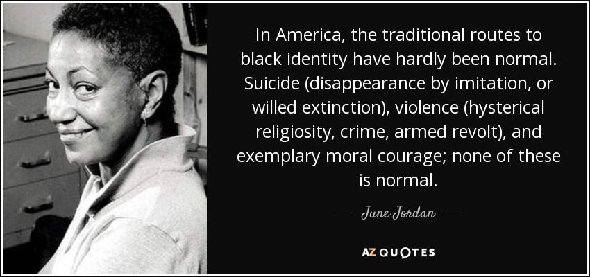 In America, the traditional routes to black identity have hardly been normal. Suicide (disappearance by imitation, or willed extinction), violence (hysterical religiosity, crime, armed revolt), and exemplary moral courage; none of these is normal.