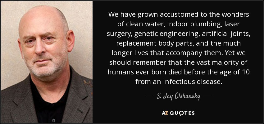We have grown accustomed to the wonders of clean water, indoor plumbing, laser surgery, genetic engineering, artificial joints, replacement body parts, and the much longer lives that accompany them. Yet we should remember that the vast majority of humans ever born died before the age of 10 from an infectious disease.