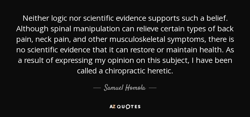 Neither logic nor scientific evidence supports such a belief. Although spinal manipulation can relieve certain types of back pain, neck pain, and other musculoskeletal symptoms, there is no scientific evidence that it can restore or maintain health. As a result of expressing my opinion on this subject, I have been called a chiropractic heretic.