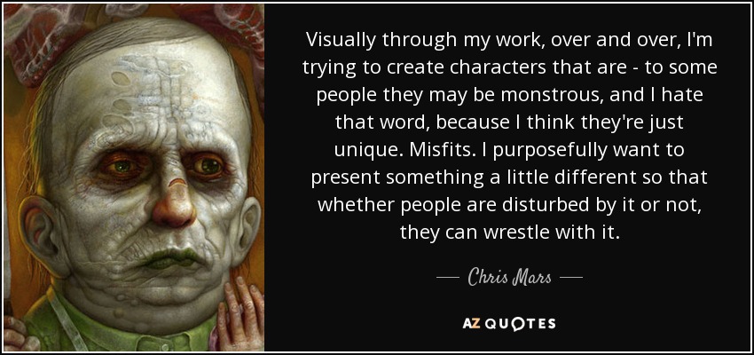Visually through my work, over and over, I'm trying to create characters that are - to some people they may be monstrous, and I hate that word, because I think they're just unique. Misfits. I purposefully want to present something a little different so that whether people are disturbed by it or not, they can wrestle with it.