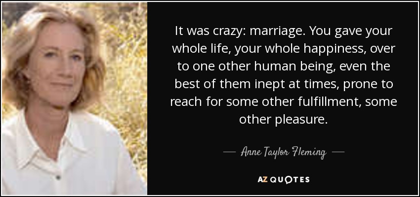 It was crazy: marriage. You gave your whole life, your whole happiness, over to one other human being, even the best of them inept at times, prone to reach for some other fulfillment, some other pleasure.