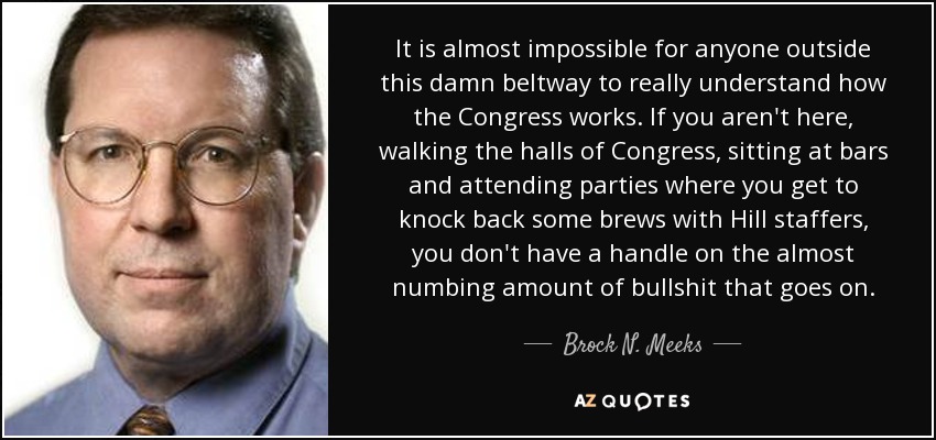 It is almost impossible for anyone outside this damn beltway to really understand how the Congress works. If you aren't here, walking the halls of Congress, sitting at bars and attending parties where you get to knock back some brews with Hill staffers, you don't have a handle on the almost numbing amount of bullshit that goes on.