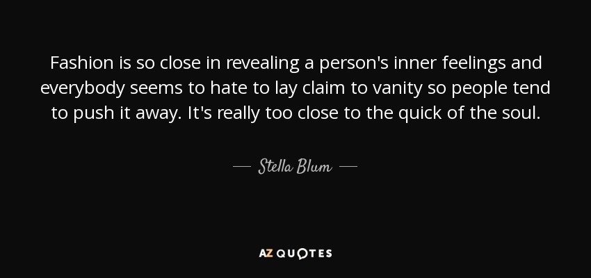 Fashion is so close in revealing a person's inner feelings and everybody seems to hate to lay claim to vanity so people tend to push it away. It's really too close to the quick of the soul.