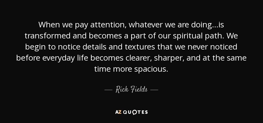 When we pay attention, whatever we are doing...is transformed and becomes a part of our spiritual path. We begin to notice details and textures that we never noticed before everyday life becomes clearer, sharper, and at the same time more spacious.