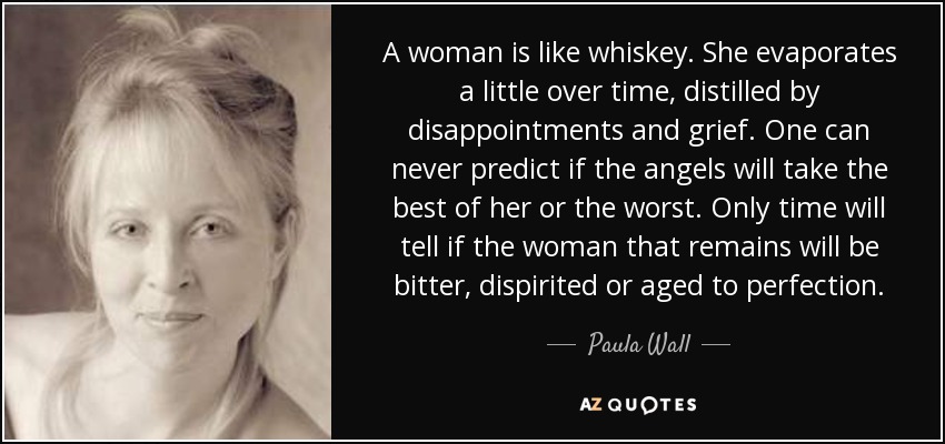 A woman is like whiskey. She evaporates a little over time, distilled by disappointments and grief. One can never predict if the angels will take the best of her or the worst. Only time will tell if the woman that remains will be bitter, dispirited or aged to perfection.