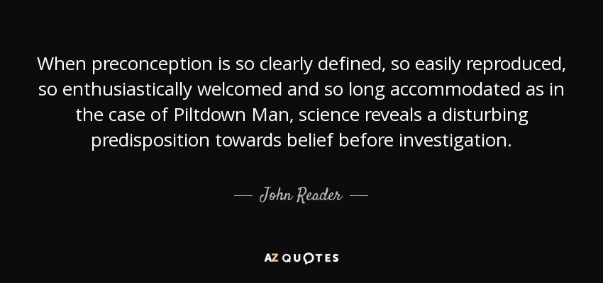 When preconception is so clearly defined, so easily reproduced, so enthusiastically welcomed and so long accommodated as in the case of Piltdown Man, science reveals a disturbing predisposition towards belief before investigation.