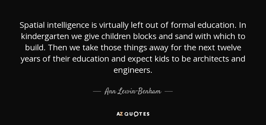 Spatial intelligence is virtually left out of formal education. In kindergarten we give children blocks and sand with which to build. Then we take those things away for the next twelve years of their education and expect kids to be architects and engineers.