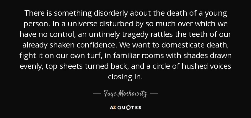 There is something disorderly about the death of a young person. In a universe disturbed by so much over which we have no control, an untimely tragedy rattles the teeth of our already shaken confidence. We want to domesticate death, fight it on our own turf, in familiar rooms with shades drawn evenly, top sheets turned back, and a circle of hushed voices closing in.