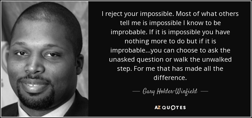 I reject your impossible. Most of what others tell me is impossible I know to be improbable. If it is impossible you have nothing more to do but if it is improbable...you can choose to ask the unasked question or walk the unwalked step. For me that has made all the difference.
