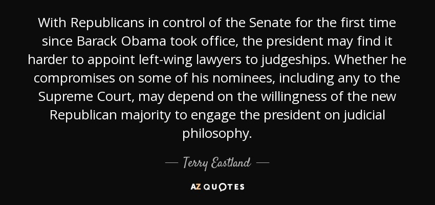 With Republicans in control of the Senate for the first time since Barack Obama took office, the president may find it harder to appoint left-wing lawyers to judgeships. Whether he compromises on some of his nominees, including any to the Supreme Court, may depend on the willingness of the new Republican majority to engage the president on judicial philosophy.