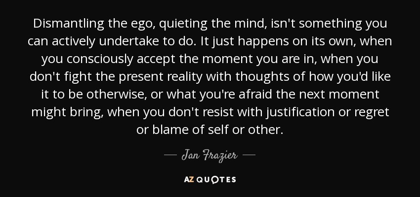 Dismantling the ego, quieting the mind, isn't something you can actively undertake to do. It just happens on its own, when you consciously accept the moment you are in, when you don't fight the present reality with thoughts of how you'd like it to be otherwise, or what you're afraid the next moment might bring, when you don't resist with justification or regret or blame of self or other.