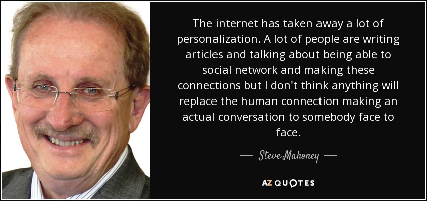 The internet has taken away a lot of personalization. A lot of people are writing articles and talking about being able to social network and making these connections but I don't think anything will replace the human connection making an actual conversation to somebody face to face.