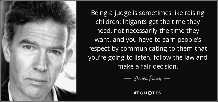 Being a judge is sometimes like raising children: litigants get the time they need, not necessarily the time they want, and you have to earn people's respect by communicating to them that you're going to listen, follow the law and make a fair decision.
