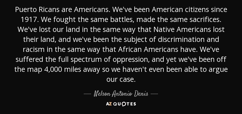 Puerto Ricans are Americans. We've been American citizens since 1917. We fought the same battles, made the same sacrifices. We've lost our land in the same way that Native Americans lost their land, and we've been the subject of discrimination and racism in the same way that African Americans have. We've suffered the full spectrum of oppression, and yet we've been off the map 4,000 miles away so we haven't even been able to argue our case.