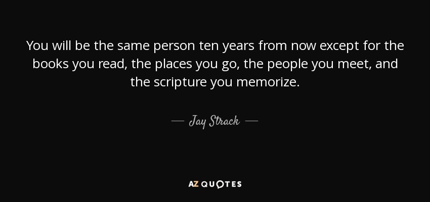 You will be the same person ten years from now except for the books you read, the places you go, the people you meet, and the scripture you memorize.