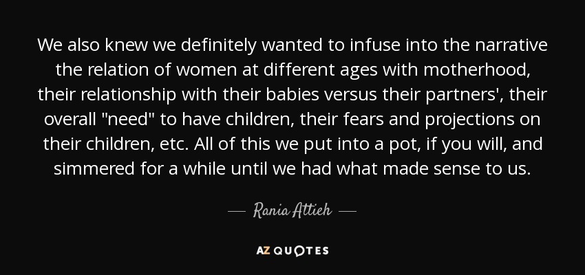 We also knew we definitely wanted to infuse into the narrative the relation of women at different ages with motherhood, their relationship with their babies versus their partners', their overall "need" to have children, their fears and projections on their children, etc. All of this we put into a pot, if you will, and simmered for a while until we had what made sense to us.