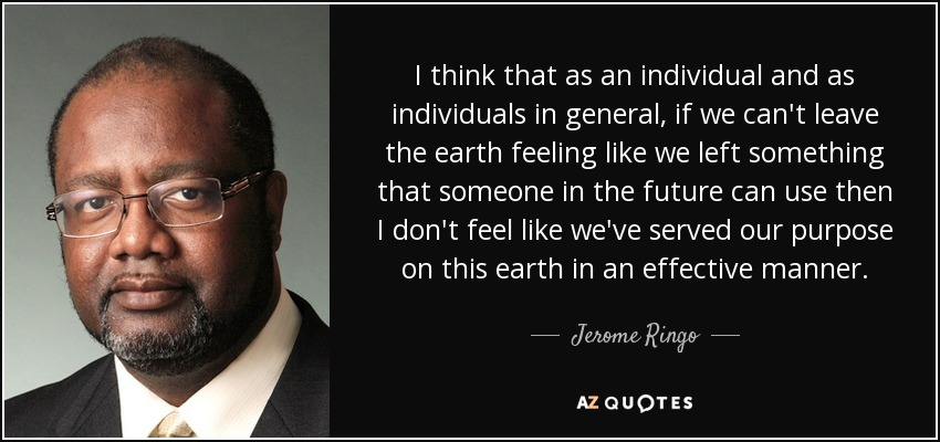 I think that as an individual and as individuals in general, if we can't leave the earth feeling like we left something that someone in the future can use then I don't feel like we've served our purpose on this earth in an effective manner.