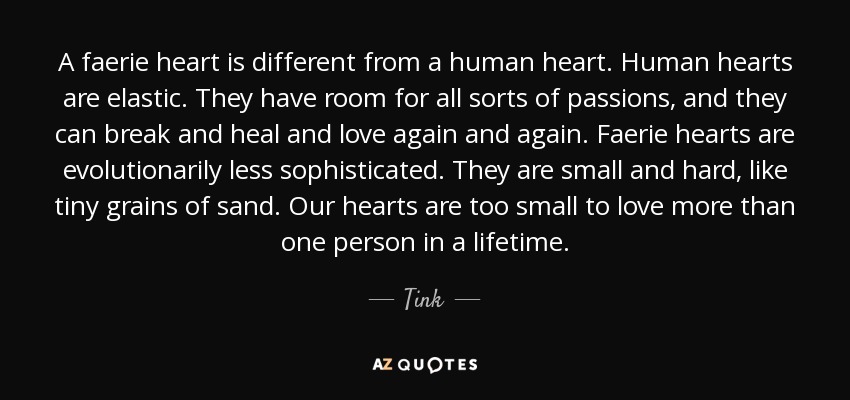 A faerie heart is different from a human heart. Human hearts are elastic. They have room for all sorts of passions, and they can break and heal and love again and again. Faerie hearts are evolutionarily less sophisticated. They are small and hard, like tiny grains of sand. Our hearts are too small to love more than one person in a lifetime.