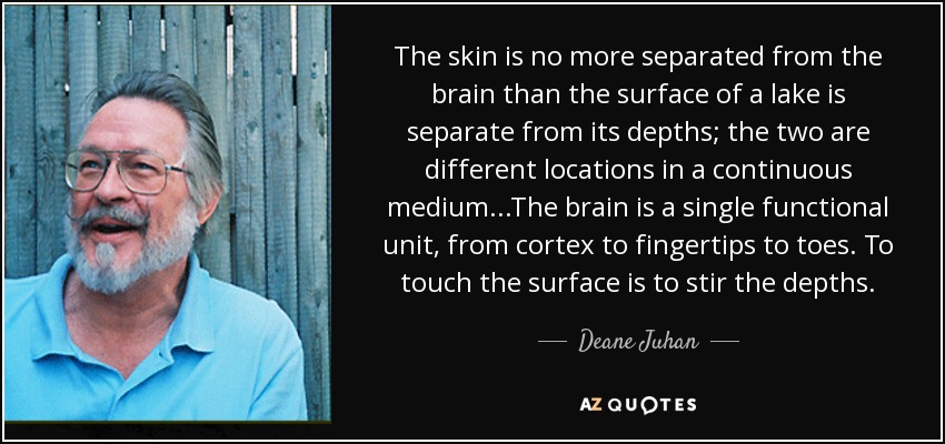 The skin is no more separated from the brain than the surface of a lake is separate from its depths; the two are different locations in a continuous medium...The brain is a single functional unit, from cortex to fingertips to toes. To touch the surface is to stir the depths.