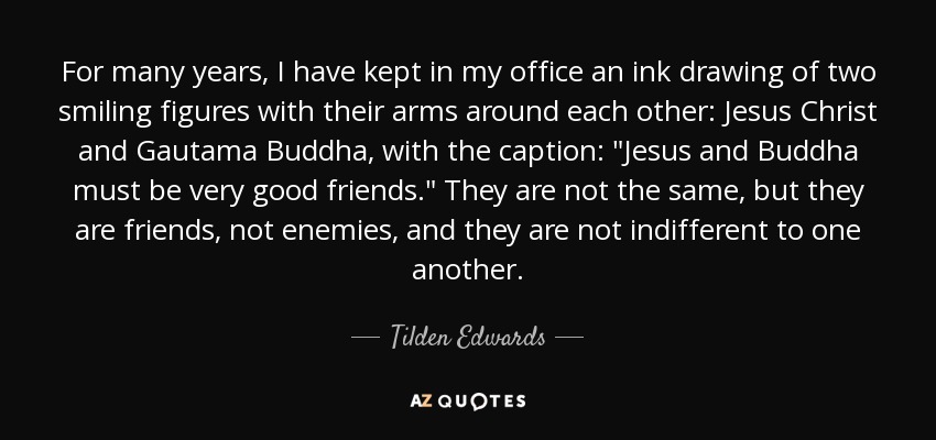 For many years, I have kept in my office an ink drawing of two smiling figures with their arms around each other: Jesus Christ and Gautama Buddha, with the caption: "Jesus and Buddha must be very good friends." They are not the same, but they are friends, not enemies, and they are not indifferent to one another.