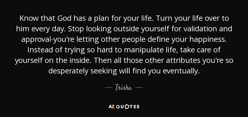 Know that God has a plan for your life. Turn your life over to him every day. Stop looking outside yourself for validation and approval-you're letting other people define your happiness. Instead of trying so hard to manipulate life, take care of yourself on the inside. Then all those other attributes you're so desperately seeking will find you eventually.