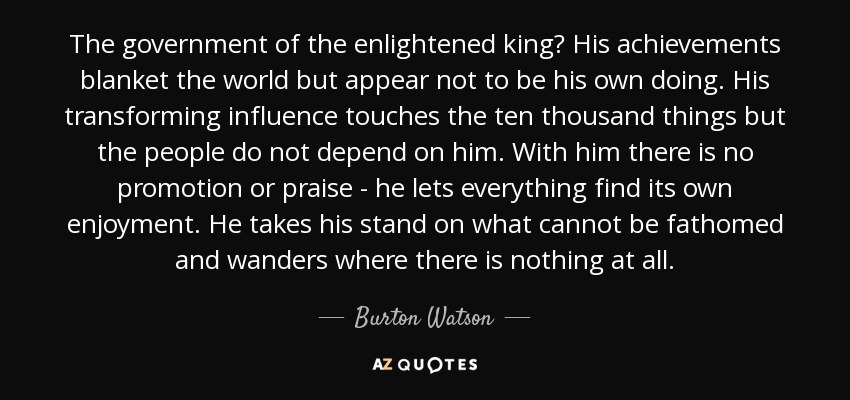 The government of the enlightened king? His achievements blanket the world but appear not to be his own doing. His transforming influence touches the ten thousand things but the people do not depend on him. With him there is no promotion or praise - he lets everything find its own enjoyment. He takes his stand on what cannot be fathomed and wanders where there is nothing at all.