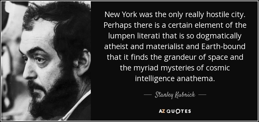 "New York was the only really hostile city. Perhaps there is a certain element of the lumpen literati that is so dogmatically atheist and materialist and Earth-bound that it finds the grandeur of space and the myriad mysteries of cosmic intelligence anathema."