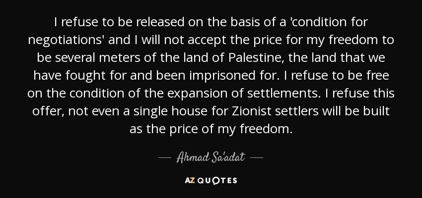 I refuse to be released on the basis of a 'condition for negotiations' and I will not accept the price for my freedom to be several meters of the land of Palestine, the land that we have fought for and been imprisoned for. I refuse to be free on the condition of the expansion of settlements. I refuse this offer, not even a single house for Zionist settlers will be built as the price of my freedom.