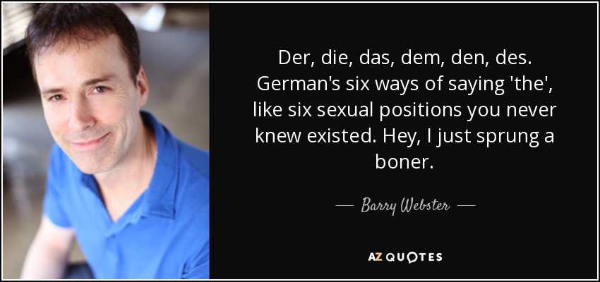 Der, die, das, dem, den, des. German's six ways of saying 'the', like six sexual positions you never knew existed. Hey, I just sprung a boner.