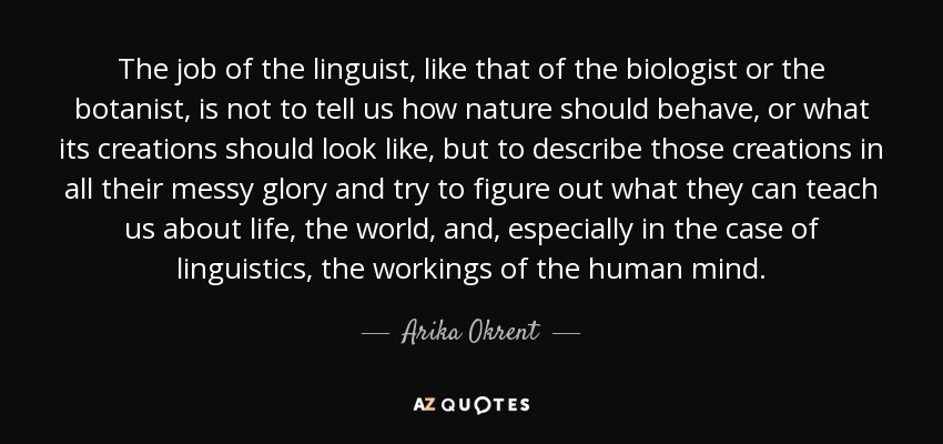The job of the linguist, like that of the biologist or the botanist, is not to tell us how nature should behave, or what its creations should look like, but to describe those creations in all their messy glory and try to figure out what they can teach us about life, the world, and, especially in the case of linguistics, the workings of the human mind.