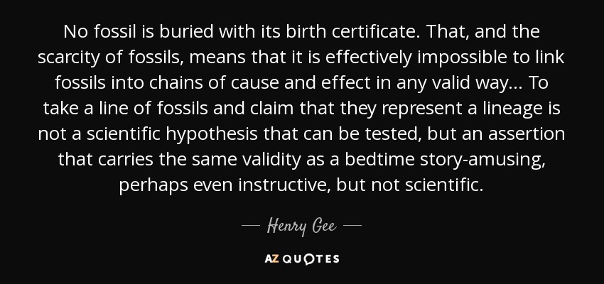 No fossil is buried with its birth certificate. That, and the scarcity of fossils, means that it is effectively impossible to link fossils into chains of cause and effect in any valid way... To take a line of fossils and claim that they represent a lineage is not a scientific hypothesis that can be tested, but an assertion that carries the same validity as a bedtime story-amusing, perhaps even instructive, but not scientific.