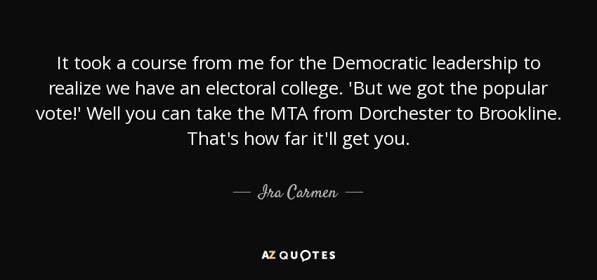 It took a course from me for the Democratic leadership to realize we have an electoral college. 'But we got the popular vote!' Well you can take the MTA from Dorchester to Brookline. That's how far it'll get you.