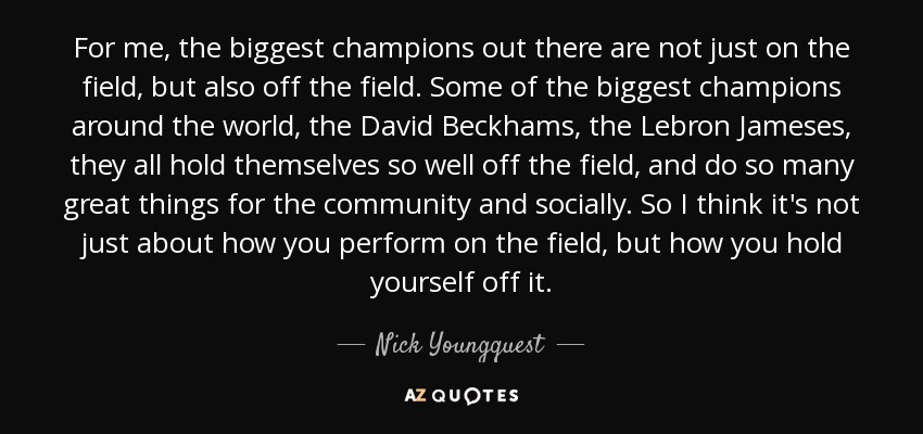 For me, the biggest champions out there are not just on the field, but also off the field. Some of the biggest champions around the world, the David Beckhams, the Lebron Jameses, they all hold themselves so well off the field, and do so many great things for the community and socially. So I think it's not just about how you perform on the field, but how you hold yourself off it.