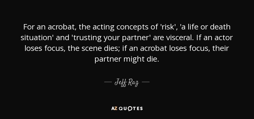 For an acrobat, the acting concepts of 'risk', 'a life or death situation' and 'trusting your partner' are visceral. If an actor loses focus, the scene dies; if an acrobat loses focus, their partner might die.