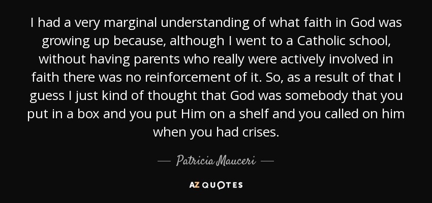 I had a very marginal understanding of what faith in God was growing up because, although I went to a Catholic school, without having parents who really were actively involved in faith there was no reinforcement of it. So, as a result of that I guess I just kind of thought that God was somebody that you put in a box and you put Him on a shelf and you called on him when you had crises.