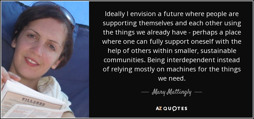 Ideally I envision a future where people are supporting themselves and each other using the things we already have - perhaps a place where one can fully support oneself with the help of others within smaller, sustainable communities. Being interdependent instead of relying mostly on machines for the things we need.