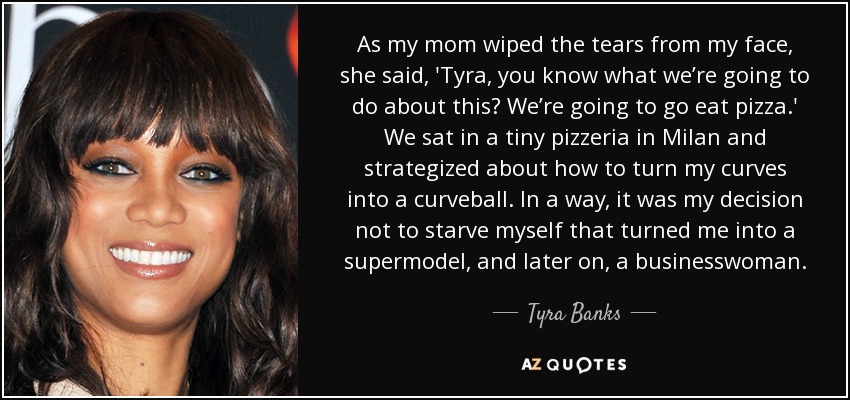 As my mom wiped the tears from my face, she said, 'Tyra, you know what we’re going to do about this? We’re going to go eat pizza.' We sat in a tiny pizzeria in Milan and strategized about how to turn my curves into a curveball. In a way, it was my decision not to starve myself that turned me into a supermodel, and later on, a businesswoman.