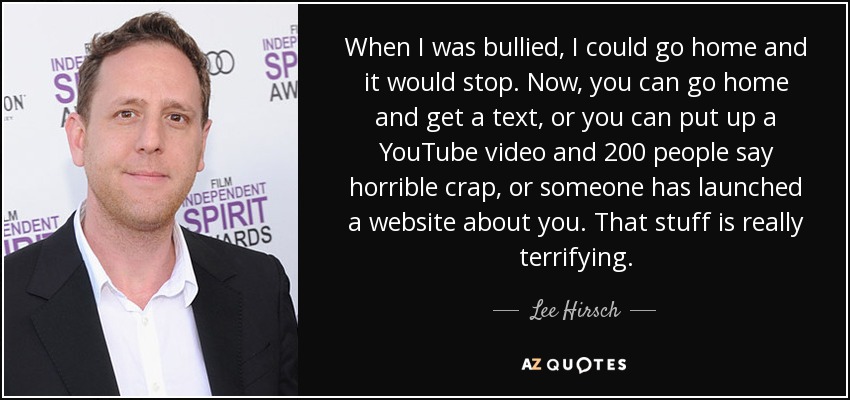 When I was bullied, I could go home and it would stop. Now, you can go home and get a text, or you can put up a YouTube video and 200 people say horrible crap, or someone has launched a website about you. That stuff is really terrifying.