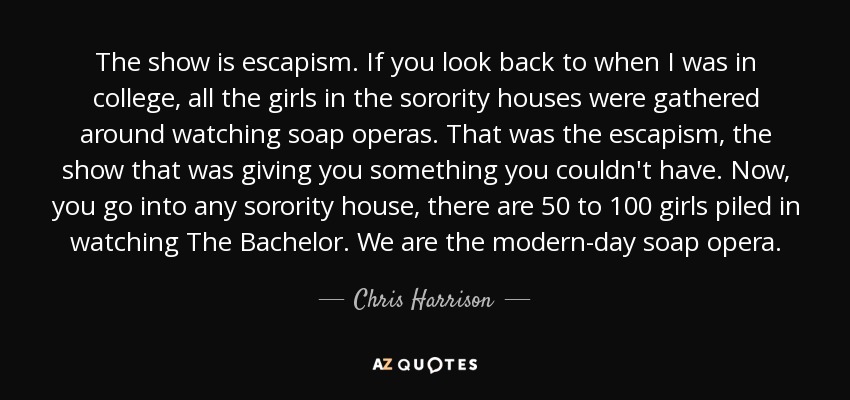 The show is escapism. If you look back to when I was in college, all the girls in the sorority houses were gathered around watching soap operas. That was the escapism, the show that was giving you something you couldn't have. Now, you go into any sorority house, there are 50 to 100 girls piled in watching The Bachelor. We are the modern-day soap opera.
