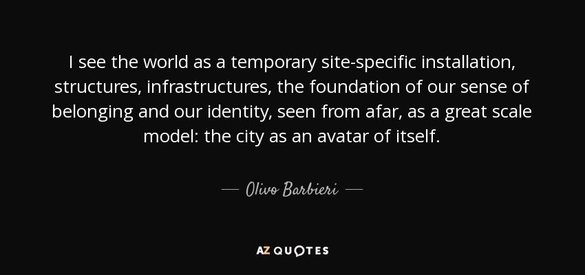 I see the world as a temporary site-specific installation, structures, infrastructures, the foundation of our sense of belonging and our identity, seen from afar, as a great scale model: the city as an avatar of itself.