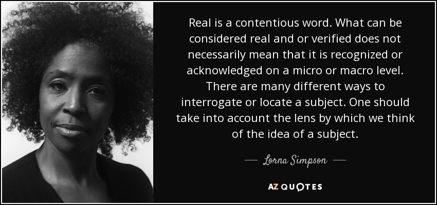 Real is a contentious word. What can be considered real and or verified does not necessarily mean that it is recognized or acknowledged on a micro or macro level. There are many different ways to interrogate or locate a subject. One should take into account the lens by which we think of the idea of a subject.