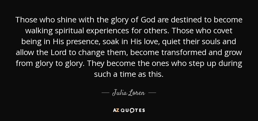 Those who shine with the glory of God are destined to become walking spiritual experiences for others. Those who covet being in His presence, soak in His love, quiet their souls and allow the Lord to change them, become transformed and grow from glory to glory. They become the ones who step up during such a time as this.