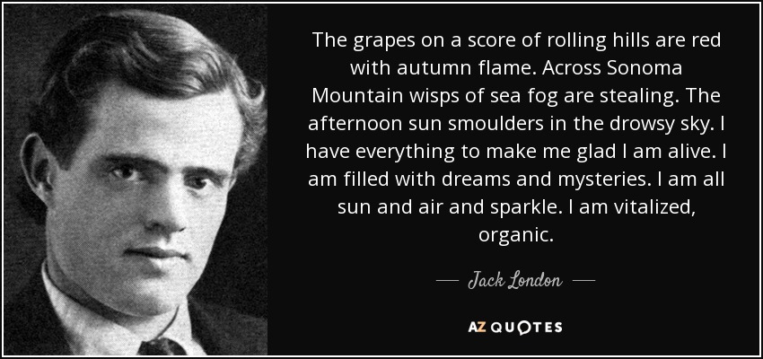 The grapes on a score of rolling hills are red with autumn flame. Across Sonoma Mountain wisps of sea fog are stealing. The afternoon sun smoulders in the drowsy sky. I have everything to make me glad I am alive. I am filled with dreams and mysteries. I am all sun and air and sparkle. I am vitalized, organic.