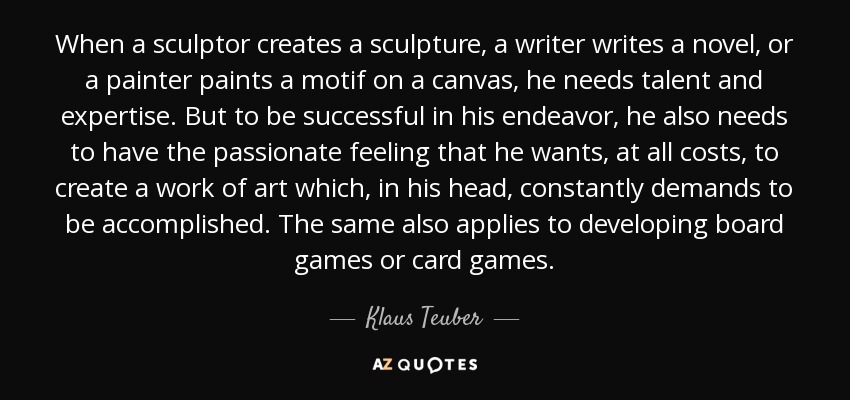 When a sculptor creates a sculpture, a writer writes a novel, or a painter paints a motif on a canvas, he needs talent and expertise. But to be successful in his endeavor, he also needs to have the passionate feeling that he wants, at all costs, to create a work of art which, in his head, constantly demands to be accomplished. The same also applies to developing board games or card games.